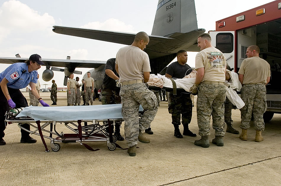 Airmen lift a woman on a litter into an ambulance on the flight line at the former Kelly Air Force Base, Texas, Aug. 30. The Texas Air National Guard C-130 brought 23 evacuees from Beaumont, Texas, to San Antonio before Hurricane Gustav reached the Gulf Coast. Members from the 37th Training Wing and 59th Medical Wing at Lackland AFB, Texas, and from the Air National Guard and Air Force Reserve help in the hurricane relief efforts as Hurricane Gustav approaches the Gulf Coast. The Port of San Antonio on Kelly AFB is the staging base for FEMA Region 6. (U.S. Air Force photo/Staff Sgt. Desiree N. Palacios)