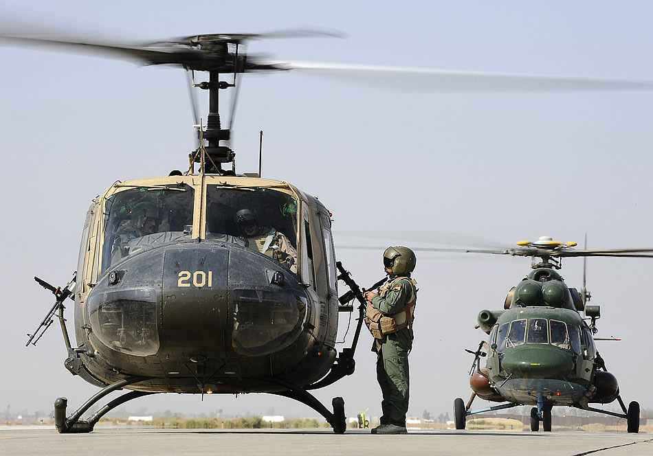 An Iraqi UH-1H Iroquois "Huey" helicopter and an Iraqi Mi-17 Hip helicopter prepare to transport a wounded Iraqi servicemember from Joint Base Balad, Iraq, to Forward Operating Base Gabe in Baqubah, Iraq, Nov. 21. The servicemember arrived at the Air Force Theater Hospital at Joint Base Balad Nov. 16 with a gunshot wound to his leg. The Iraqi air force is developing its aeromedical evacuation capabilities to take on a greater role in transporting its patients. (U.S. Air Force photo/Airman 1st Class Jason Epley)
