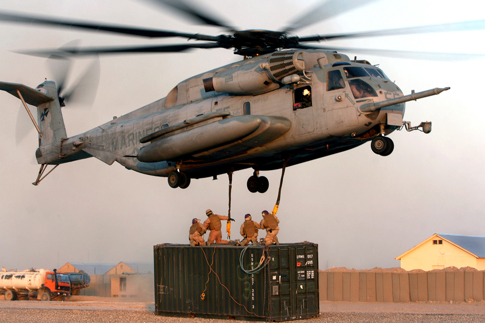 U.S. Marines hook a shipping container with more than 20,000 pounds of supplies to a CH-53E Super Stallion helicopter on Forward Operating Base Delaram, Afghanistan, Jan. 2, 2009. The Marines are assigned to Helicopter Support Team Marine. The supplies will be used to construct a forward operating base or combat outpost. U.S. Marine Corps photo by Sgt. Juan D. Alfonso