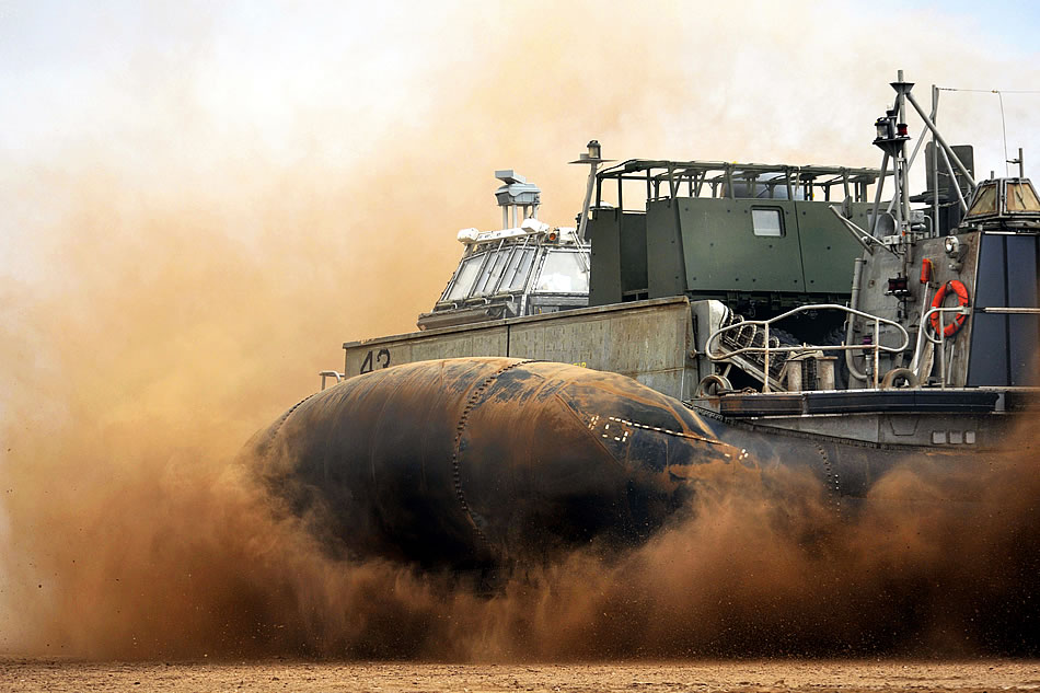 A Landing Craft Air Cushion from Assault Craft Unit-5 comes ashore on a beach during an exercise near Camp Lemonier, Djibouti, April 1, 2009. U.S. Navy photo by Petty Officer 2nd Class Jesse B. Awalt