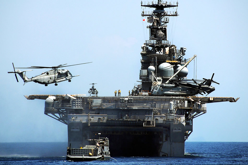 A CH-53E Sea Stallion helicopter lands aboard the amphibious assault ship USS Essex as a landing craft utility vehicle approaches to enter the well deck in the South China Sea, April 13, 2009. Essex is participating in Balikatan 2009, an annual bilateral exercise involving U.S. military and Armed Forces of the Philippines personnel. U.S. Navy photo by Petty Officer 2nd Class Mark R. Alvarez