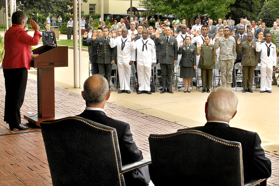 Homeland Security Secretary Janet Napolitano administers the oath of allegiance to 31 immigrant military service personnel representing 20 different countries of origin during a naturalization ceremony in the Pentagon courtyard, Sept. 10, 2009. Defense Secretary Robert M. Gates, seated right with Alejandro Mayorkas, director of the U.S. Citizenship and Immigration Service, later addressed the new citizens, family members and guests. DoD photo by R. D. Ward