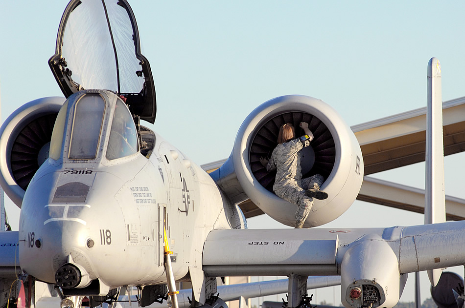 Airman Jill Hallandsworth performs a preflight engine check on an A-10 Thunderbolt II during an overall aircraft inspection Sept. 25, 2009, at Whiteman Air Force Base, Mo. Airman Hallandsworth is a 442nd Fighter Wing crew chief. (U.S. Air Force photo/Senior Airman Kenny Holston)