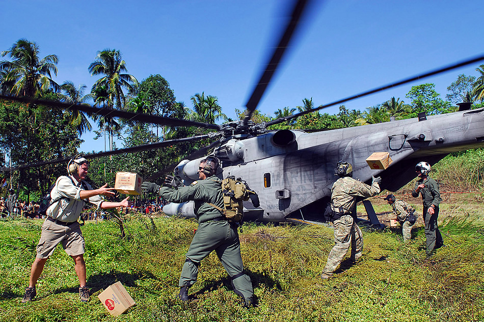 U.S. Air Force personnel and U.S. Marines unload a CH-53E Super Stallion helicopter carrying relief supplies for remote areas of Indonesia, following two earthquakes, Padang, Indonesia, Oct. 9, 2009. U.S. Navy photo by Petty Officer 2nd Class Byron C. Linder