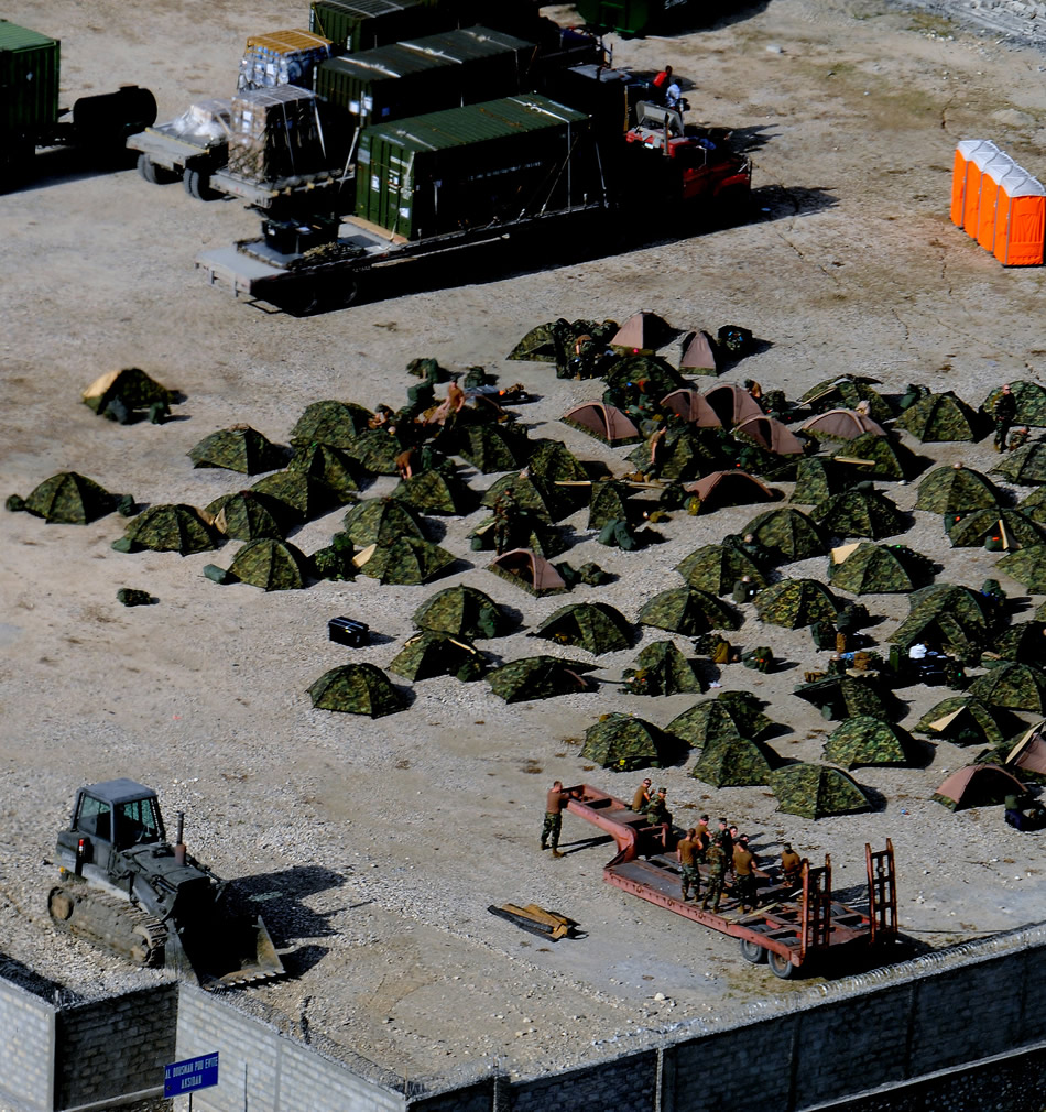 PORT-AU-PRINCE, Haiti (Jan. 27, 2010) Marines assigned to the 22nd Marine Expeditionary Unit (22nd MEU), embarked aboard the amphibious assault ship USS Batman (LHD 5), live in a tent-city while providing support during Operation Unified Response. Bataan, along with amphibious dock landing ships USS Fort McHenry (LSD 43), USS Gunston Hall (LSD 44) and USS Carter Hall (LSD 50), is supporting Operation Unified Response and is providing military support capabilities to civil authorities to help stabilize and improve the situation in Haiti following a 7.0 magnitude earthquake on Jan. 12, 2010. (U.S. Navy photo by Mass Communication Specialist 1st Class W. B. Swoboda)