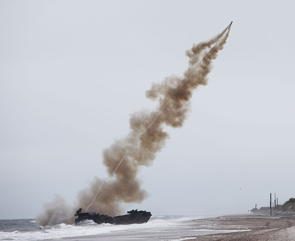 An amphibious assault vehicle assigned to the 2nd Amphibious Assault Battalion fires a line charge at Camp Lejeune, N.C. A line charge is composed of more than 1750 pounds of explosives and is used to clear beachhead entries during an amphibious assault. (U.S. Marine Corps photo by Lance Cpl. Brian A. Kinney)