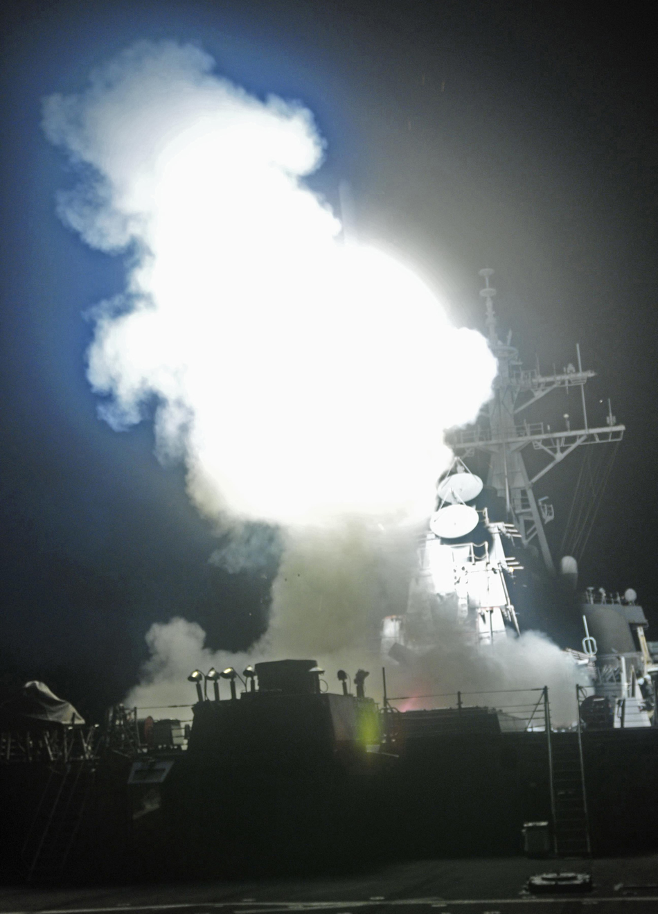 MEDITERRANEAN SEA (March. 19, 2011) The Arleigh Burke-class guided-missile destroyer USS Barry (DDG 52) launches a Tomahawk missile in support of Operation Odyssey Dawn. This was one of approximately 110 cruise missiles fired from U.S. and British ships and submarines that targeted about 20 radar and anti-aircraft sites along Libya's Mediterranean coast. Joint Task Force Odyssey Dawn is the U.S. Africa Command task force established to provide operational and tactical command and control of U.S. military forces supporting the international response to the unrest in Libya and enforcement of United Nations Security Council Resolution (UNSCR) 1973. (U.S. Navy photo by Mass Communication Specialist 3rd Class Jonathan Sunderman)
