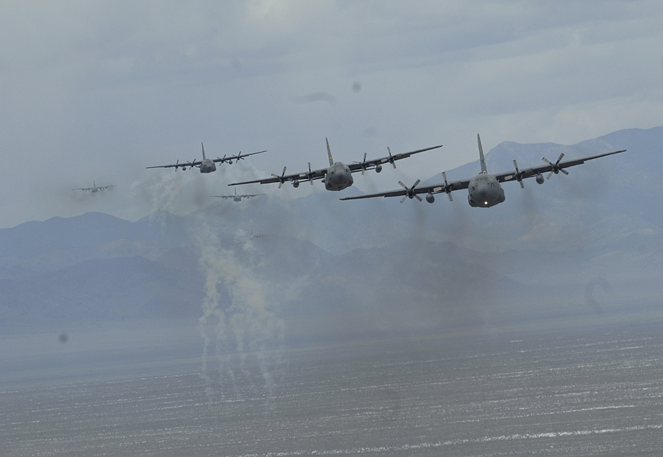 A formation of C-130 Hercules fly May 18, 2011, during an exercise above the Nevada Test and Training Range. (U.S. Air Force photo/Master Sgt. Kevin J. Gruenwald)