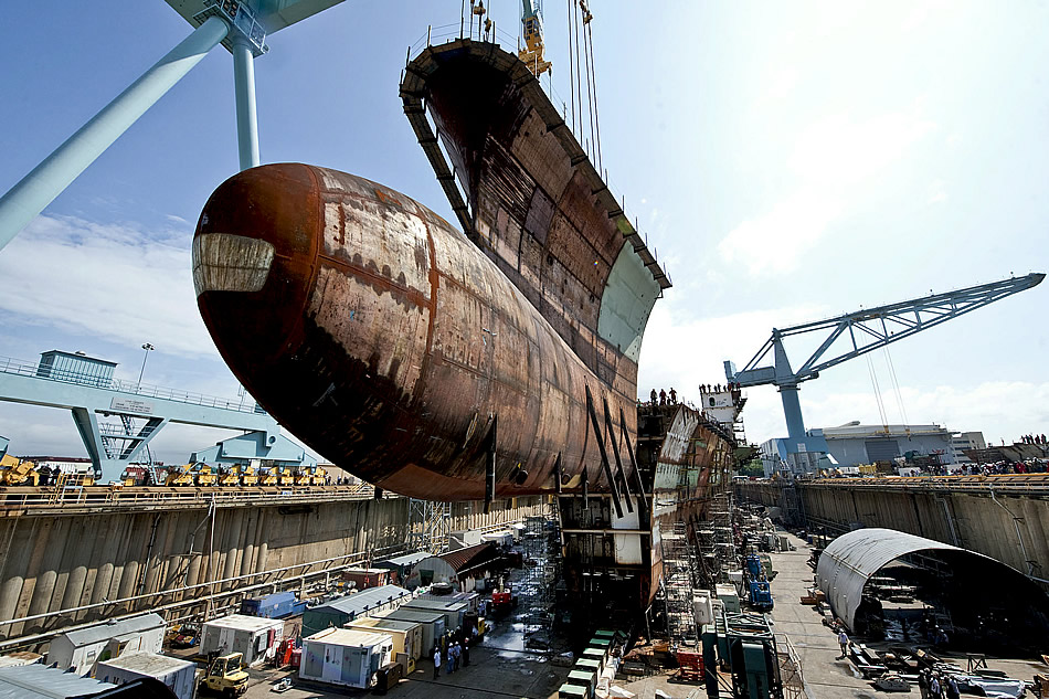Crews lower the final keel section of the future USS Gerald R. Ford into place at Huntington Ingalls Industries-Newport News Shipbuilding in Newport News, Va., May 24, 2012. The 680-metric-ton, 60-foot-tall lower bow unit was the last major section of the ship installed below the waterline. The Gerald R. Ford, now more than 75 percent structurally complete in the dry dock, is on schedule to launch in 2013. U.S. Navy photo by Ricky Thompson