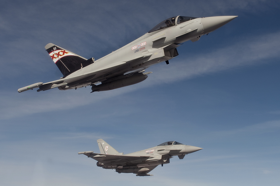 The newly painted tail of the RAF Typhoon Display jet, from 29 Reserve (R) Squadron (Sqn) is flown for the first time and accompanied by a Typhoon in the original design.
