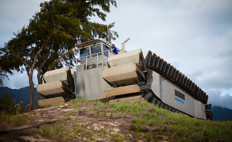MARINE CORPS BASE HAWAII (July 11, 2014) The ultra heavy-lift amphibious connector (UHAC), a prototype amphibious vehicle, runs over uneven terrain on its way to shore during a Marine Corps Warfighting Experiment. Twenty-two nations, more than 40 ships and submarines, about 200 aircraft and 25,000 personnel are participating in RIMPAC from June 26 to Aug. 1 in and around the Hawaiian Islands and Southern California. (U.S. Marine Corps photo by Lance Cpl. Aaron S. Patterson/)