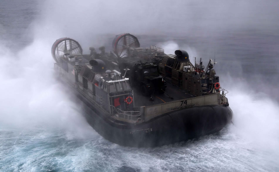 A landing craft air cushion (LCAC) departs the USS Makin Island as they depart San Diego July 26, 2014. The 11th Marine Expeditionary Unit and Makin Island Amphibious Ready Group are a sea-based, expeditionary crisis response force capable of conducting amphibious missions across the full range of military operations. (U.S. Marine Corps photo by Lance Cpl. Laura Y. Raga)