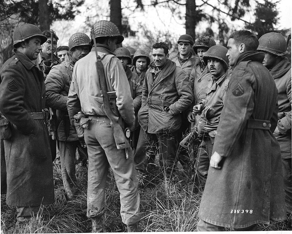 These American soldiers from the 28th Division Band and Quartermaster Company, stayed and fought Germans in Wiltz, Belgium, until their ammunition was exhausted. Shown at Bastogne, Belgium. 12/20/44.