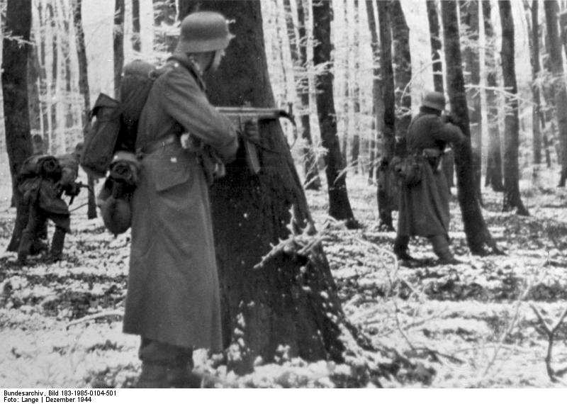 A German regiment is enclosed in a forest in Luxembourg. Behind trees the grenadiers fire at the enemy and try to break through; Recorded on 22.12.1944 (translation from German) Attribution: Bundesarchiv, Bild 183-1985-0104-501 / Lange / CC-BY-SA 3.0
