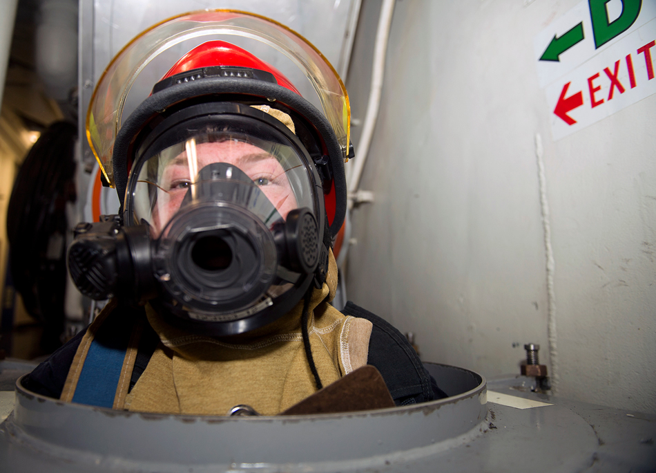 PACIFIC OCEAN (Jan. 9, 2017) Damage Controlman 2nd Class Billy Masten passes through a scuttle during a fire drill aboard the Ticonderoga-class guided-missile cruiser USS Lake Champlain (CG 57). The ship is part of the Carl Vinson Carrier Strike Group which will report to the U.S. 3rd Fleet, headquartered in San Diego, while deployed to the western Pacific as part of the U.S. Pacific Fleet led initiative to extend the command and control functions of 3rd Fleet into the region. (U.S. Navy photo by Mass Communication Specialist 2nd Class Nathan K. Serpico)