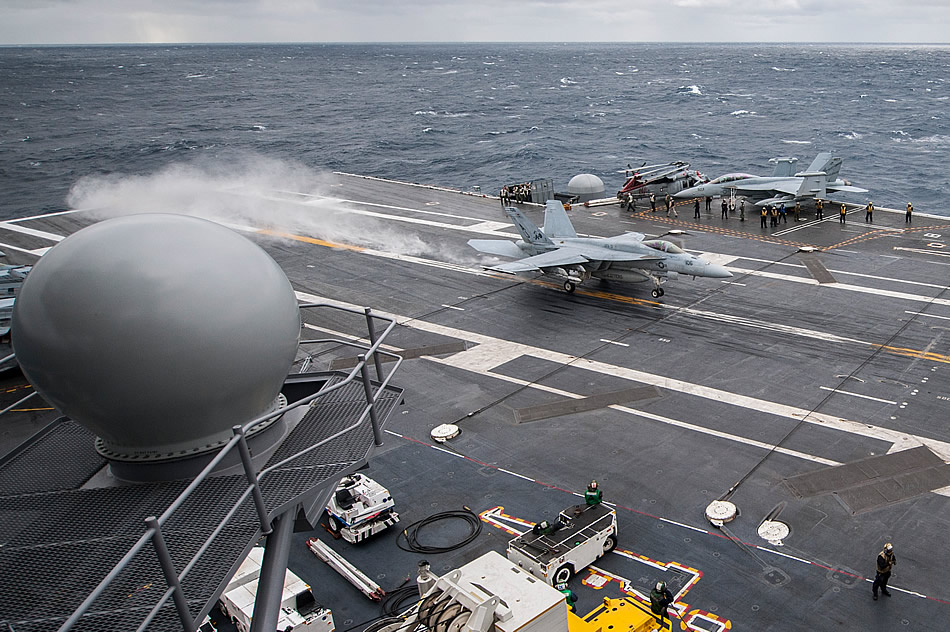 An F/A-18E Super Hornet attached to Strike Fighter Squadron (VFA) 31 lands on the flight deck of the aircraft carrier USS George H.W. Bush (CVN 77). The ship is deployed with its carrier strike group in support of maritime security operations and theater security cooperation efforts in the U.S. 5th and 6th Fleet areas of operation. U.S. Navy photo by Mass Communication Specialist 3rd Class Christopher Gaines