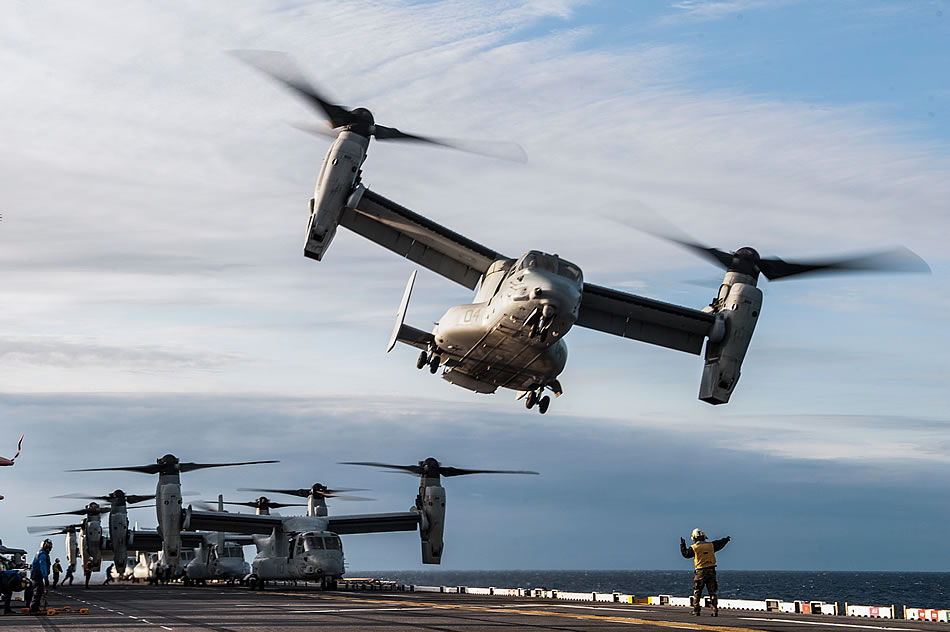 ATLANTIC OCEAN (Jan. 27, 2017) A MV-22 Osprey aircraft assigned to Marine Medium Tiltrotor Squadron 365 (Reinforced) lifts off from the flight deck of the amphibious assault ship USS Bataan (LHD 5). The ship is underway conducting a composite training unit exercise with its amphibious ready group in preparation for an upcoming deployment. (U.S. Navy photo by Mass Communication Specialist 3rd Class Caleb Strong/Released)