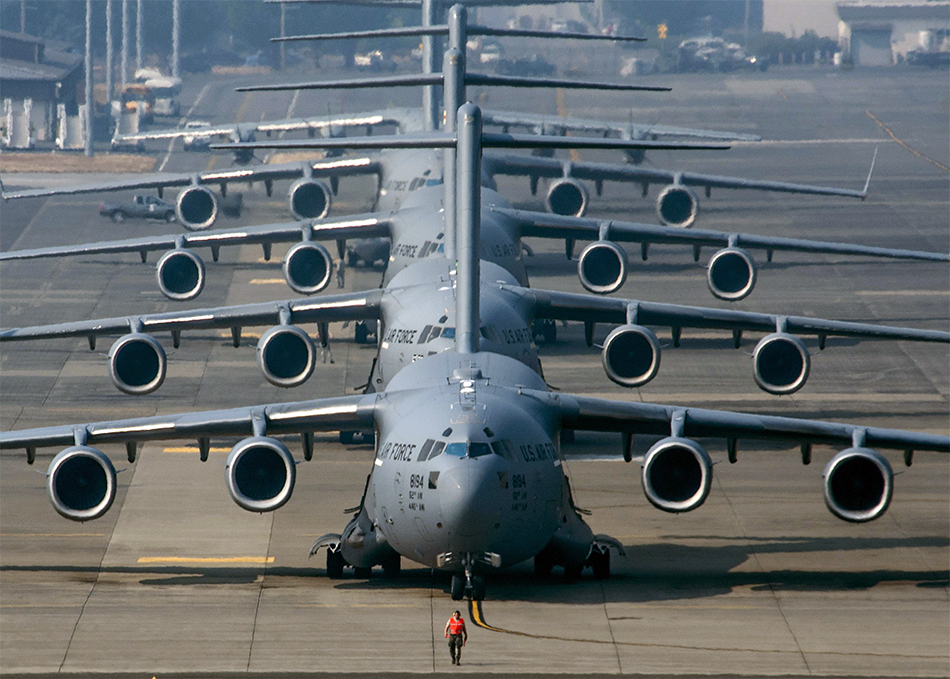 Four C-17 Globemaster III's and a C-130 Hercules line up in preparation for Mobility Guardian's elephant walk, Joint Base Lewis-McChord, Wash., Aug. 2, 2017. More than 3,000 Airmen, Soldiers, Sailors, Marines and international partners converged on the state of Washington in support of Mobility Guardian. The exercise is intended to test the abilities of the Mobility Air Forces to execute rapid global mobility missions in dynamic, contested environments. Mobility Guardian is Air Mobility Command's premier exercise, providing an opportunity for the Mobility Air Forces to train with joint and international partners in airlift, air refueling, aeromedical evacuation and mobility support. The exercise is designed to sharpen Airmen’s skills in support of combatant commander requirements. (U.S. Air Force photo/Tech. Sgt. Jodi Martinez)