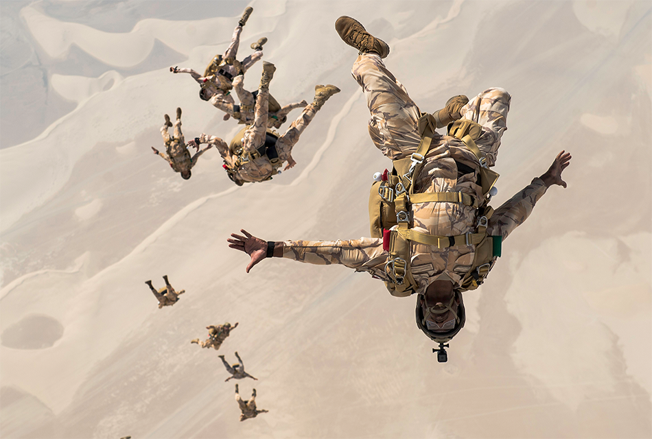 Qatari special operations personnel conduct a military free-fall Friendship Jump over Qatar on Aug. 21, 2017. In support of continued partnerships between the U.S. and Qatar, special forces from the two nations participated in a static-line and military free-fall parachute training exercise. This marked the first event of its kind conducted between the U.S. and Qatar, allowing the enhanced interoperability between special forces from both nations. (U.S. Air Force photo by Staff Sgt. Trevor T. McBride)