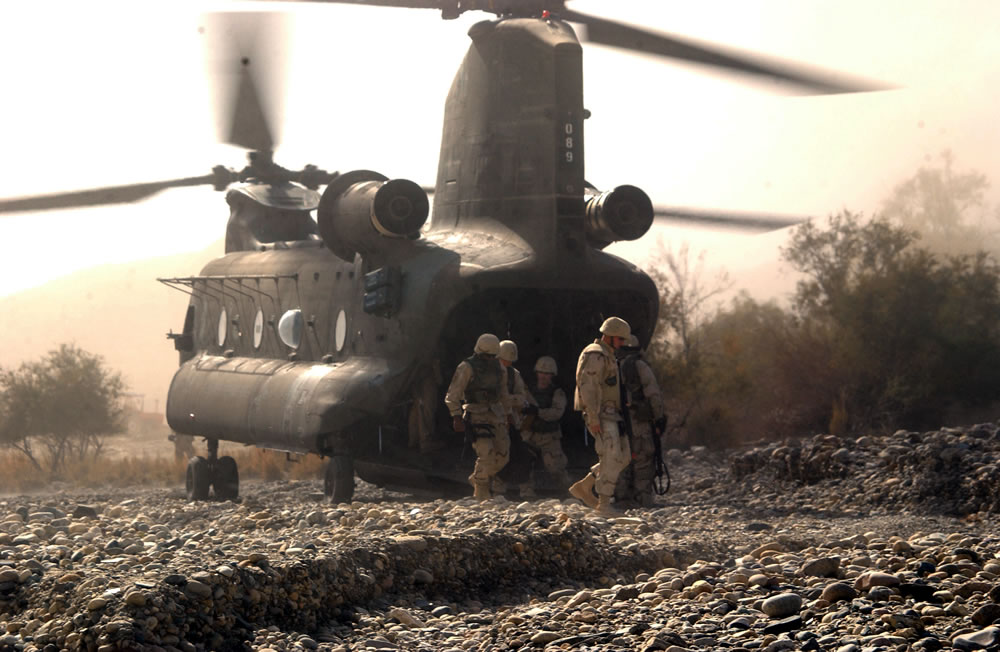 11/01/04 - A 14th Aviation Regiment Chinook helicopter on a landing zone in Jegdalek, Afghanistan, Nov. 1, 2004. Task Force Pirate Soldiers adopted the remote village of Jegdalek from the Parwan Provincial Reconstruction Team and have been delivering humanitarian aid and medical assistance to the village since the beginning of August 2004.