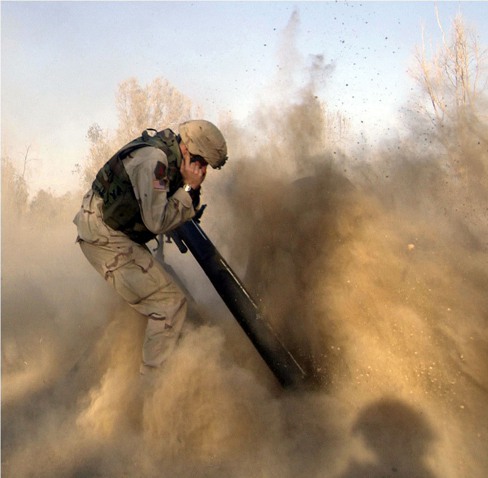 November 29, 2004Spc. Paul Sakala, from the 4th Cavalry Regiment, 1st Infantry Division, fires his 120mm mortar at insurgents near Forward Operating Base Wilson, Iraq