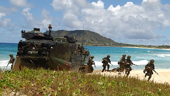 U.S. Marines assigned to 3rd Battalion, 3rd Marine Regiment disembark Amphibious Assault Vehicles during a mechanized raid in support of exercise Rim of the Pacific (RIMPAC) 2004, Marine Corps Base, Hawaii, July 18, 2004. RIMPAC is the largest international maritime exercise in the waters around the Hawaiian Islands. This year's exercise includes seven participating nations; Australia, Canada, Chile, Japan, South Korea, the United Kingdom and the United States. RIMPAC is intended to enhance the tactical proficiency of participating units in a wide array of combined operations at sea, while enhancing stability in the Pacific Rim region. (U.S. Navy photo by Photographer's Mate 1st Class Jane West)