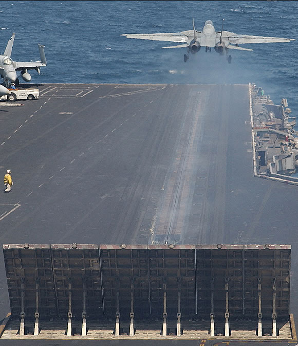 An F-14B Tomcat assigned to the Jolly Rogers of Fighter Squadron One Zero Three (VF 103) launches from flight deck of USS John F. Kennedy (CV 67) in the Arabian Gulf, Aug. 20, 2004. Kennedy and her embarked Carrier Air Wing (CVW 17) are operating in the Middle East region as part of Operation Iraqi Freedom.