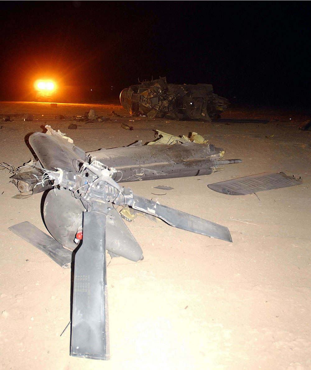 TALLIL AIR BASE, Iraq -- Lights from a portable lighting cart illuminate the wreckage of an Army UH-60 Blackhawk crash across the flightline here Sept. 21. All four Soldiers on board were rescued from the helicopter by people of the 407th Air Expeditionary Group and 407th Expeditionary Medical Squadron.