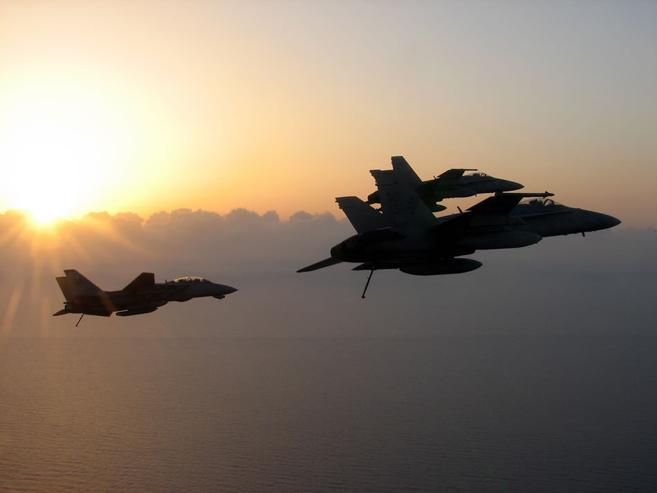 Mediterranean Sea (Sept. 25, 2005) - Two F/A-18C Hornets, assigned to the "Golden Warriors" of Strike Fighter Squadron Eight Seven (VFA-87), and an F-14D Tomcat, assigned to the "Black Lions" of Fighter Squadron Two One Three (VF-213), fly in a loose formation with their tailhooks down during a late evening mission over the Mediterranean Sea. VFA-87 and VF-213 are assigned to Carrier Air Wing Eight (CVW-8), currently embarked aboard the Nimitz-class aircraft carrier USS Theodore Roosevelt (CVN 71). U.S. Navy photo by Lt.j.g. Scott Timmester.
