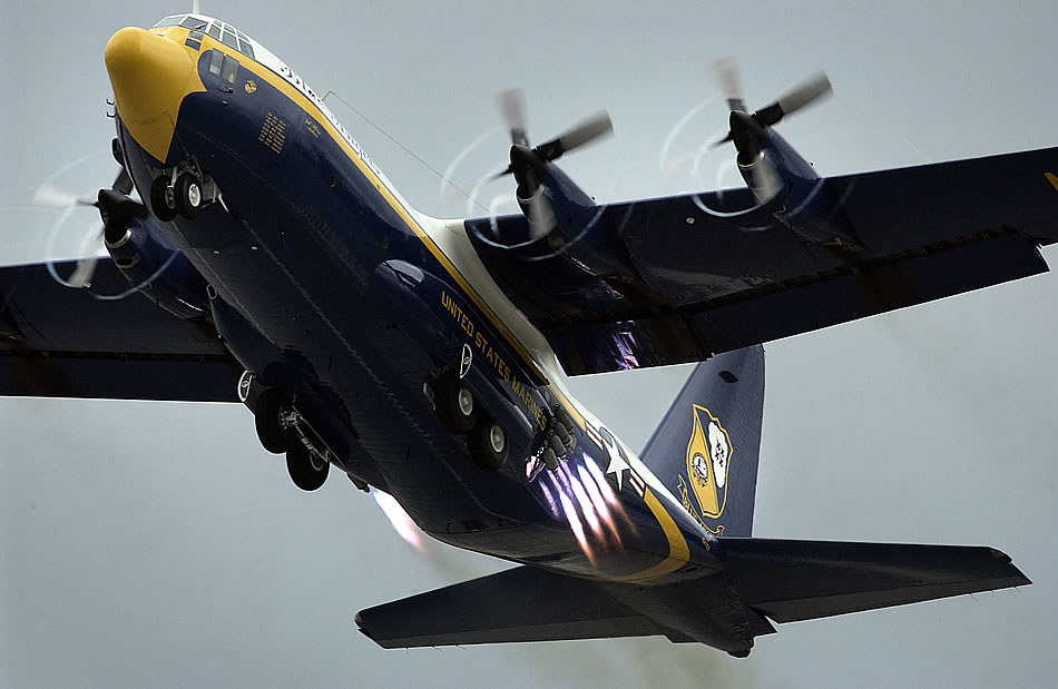 The Blue Angels� Marine Corps C-130F Hercules �Fat Albert� lifts into the sky as the JATO (Jet Assisted Take-Off) bottles fire, giving the plane an extra 8,000 pounds of thrust.
