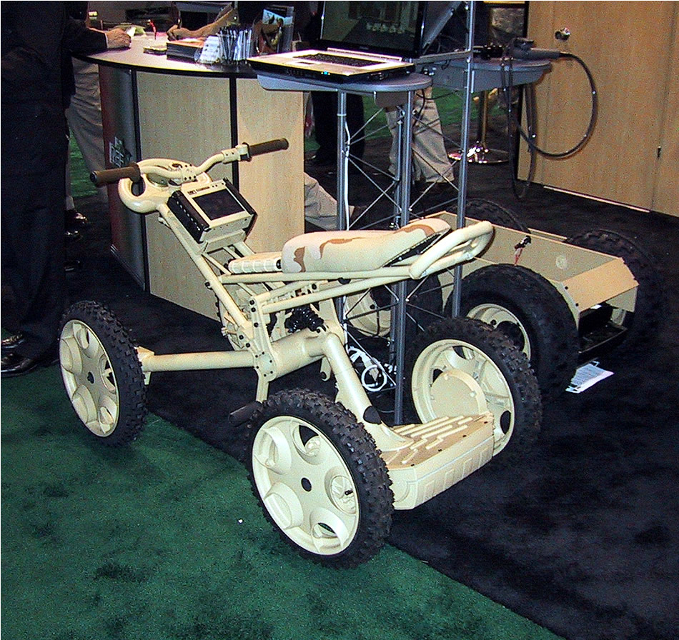 REF thought well-enough of the militarized Segway effort to bring it along as a show-and-tell piece at an Army association conference earlier this month. Currently, the GI Segway is able to travel on either two or four wheels at a top speed of 40 kilometers per hour � not fast, but it beats marching around with over 100 pounds of gear on while patrolling. Since it has a quiet electric motor, it has a very low noise and heat (IR) profile, so you can more easily creep up on people. It can carry up to two riders or 300 pounds of payload.