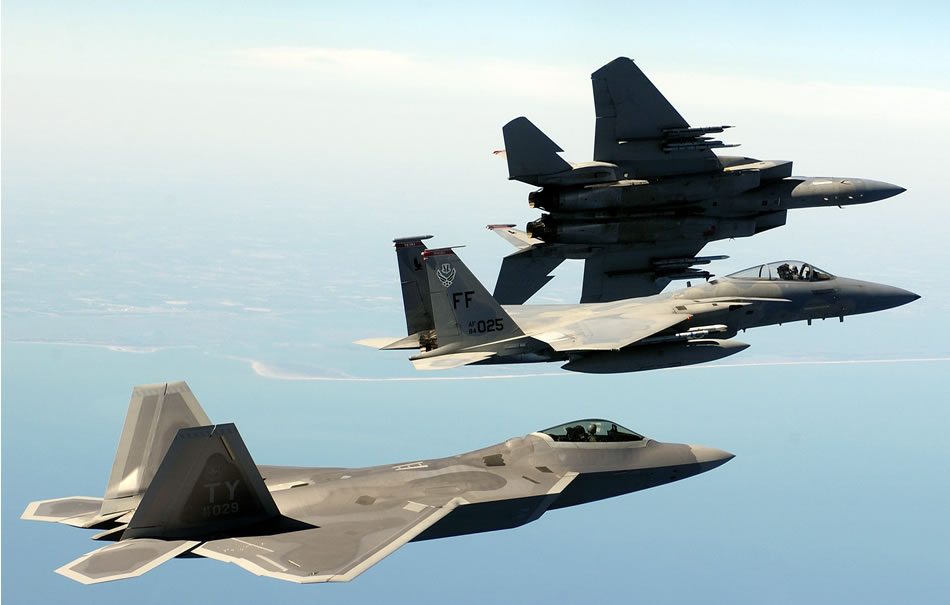 04/05/05 - Maj. Kevin Dolata and 1st Lt. Alex Edwards, both F-15 Eagle pilots with the 1st Fighter Wing, and Maj. Charles Corcoran, an F/A-22 Raptor pilot assigned to the 27th Fighter Squadron, fly in formation en route to a training area off the coastline of Va., on April 5, 2005. The 27th Fighter Squadron is currently performing regular operations with two Raptors on loan from Tyndall Air Force Base, Fla. (U.S. Air Force photo by Tech. Sgt. Ben Bloker)