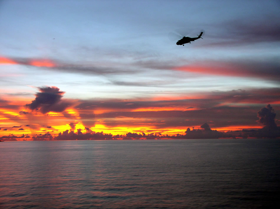 South China Sea (May 25, 2005) - An SH-60B �Seahawk� helicopter from Helicopter Anti-submarine Squadron Lite 45 (HSL-45), Det. 1, flies into the South China Sea sunset after leaving the flight deck aboard the dock landing ship USS Fort McHenry (LSD 43), following deck landing qualifications. HSL-45 Det. 1 is assigned to the frigate USS Rodney M. Davis (FFG 60) participating in Southeast Asia Cooperation Against Terrorism (SEACAT) 2005. SEACAT is a weeklong, at sea anti-terrorism exercise in the Philippine and South China Seas. U.S. Navy photo by Chief Journalist Melinda Larson