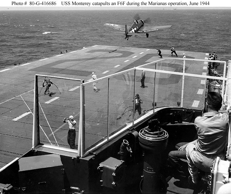 Catapults a F6F "Hellcat" fighter during operations in the Marianas area, June 1944.Note flight deck numbers, crewmen with catapult bridles, plexiglass bridge windscreen and pelorus.