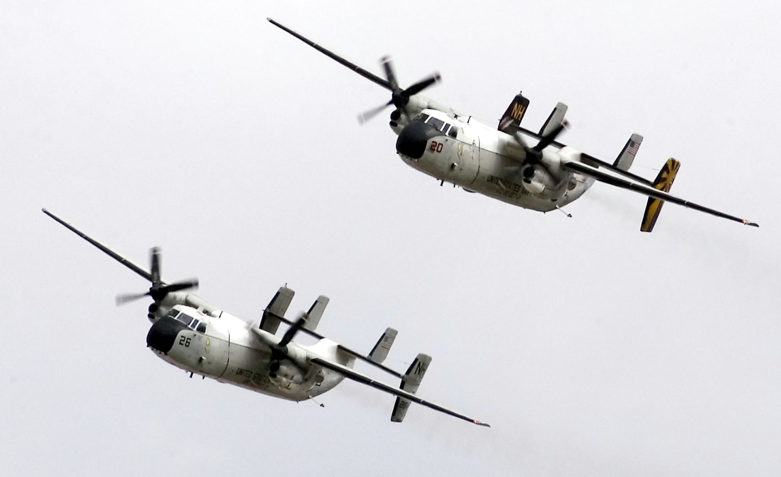 SAN DIEGO (Sept. 29, 2007) - Two C-2A Greyhounds attached to the �Crusaders" of Fleet Logistics Support Squadron (VRC) 30, conduct a flyover upon their return to Naval Air Station North Island. VRC-30 was embarked aboard USS Nimitz (CVN 68) assigned to Carrier Air Wing (CVW) 11 during the carrier strike group�s six-month deployment. U.S. Navy photo by Mass Communication 2nd Class Mark A. Leonesio
