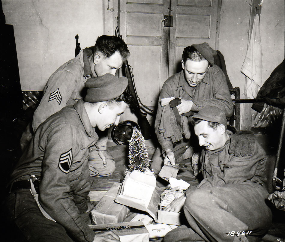 Sitting around a miniature Christmas tree and opening a Christmas package are (front row, left to right) S/Sgt. John F. Suchanek; and Pfc. Joseph G. Pierro; and (back row) Sgt. Charles M. Myrich; and Sgt. Leon L. Oben. All are members of F. A. Bn., 3rd Div. Pietramelara, Italy. December 16, 1943.