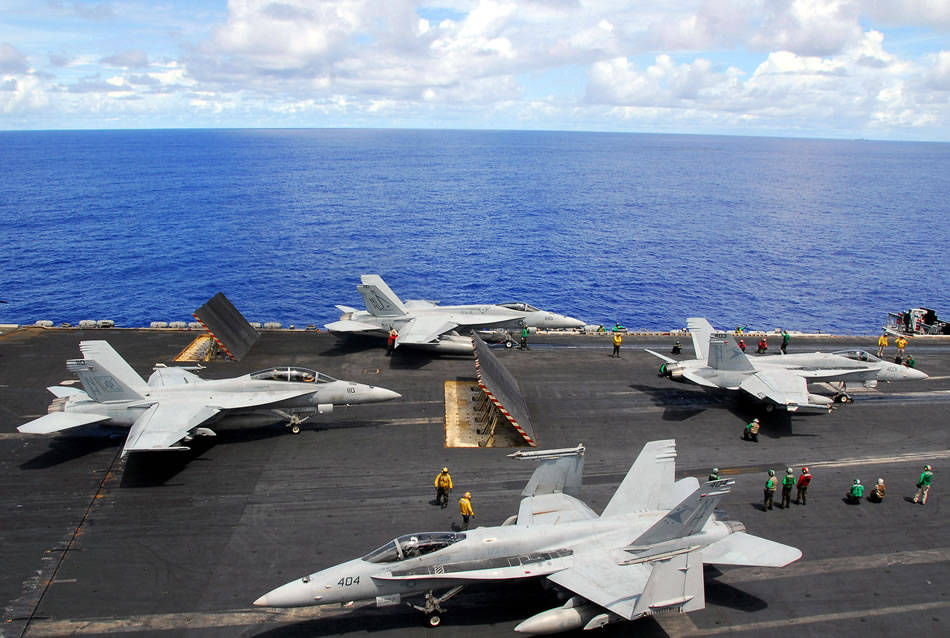 PACIFIC OCEAN (Aug. 9, 2007) - A group of F/A-18 Hornets and Super Hornets attached to Carrier Air Wing (CVW) 11 prepare to launch off the flight deck of the nuclear-powered aircraft carrier USS Nimitz (CVN 68). The Nimitz Carrier Strike Group (CSG) and embarked (CVW) 11 are deployed in the U.S. 7th Fleet area of operations, participating in exercise Valiant Shield 2007. Valiant Shield the largest joint exercise in recent history, includes 30 ships, more than 280 aircraft and more than 20,000 service members from the Navy, Marine Corps, Air Force and Coast Guard. U.S. Navy photo by Mass Communication Specialist 3rd Class Eduardo Zaragoza