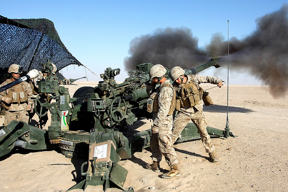 A Paladin fires its 155mm Howitzer from Badoush Prison near Mosul to expose enemy movement, March 29, 2008. The Howitzer belongs to Howitzer Battery, 3d Armored Cavalry Regiment from Fort Hood, Texas. U.S. Army Spc. John Crosby