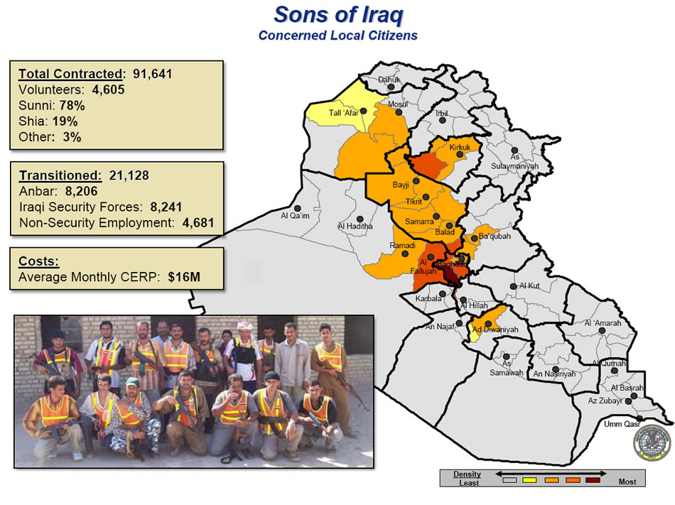 A Multinational Force Iraq map shows the number of Iraqis who've become part of the Sons of Iraq working to counter al-Qaida and insurgents in Iraq. U.S. Army Gen. David H. Petraeus submitted the chart as part of his testimony before Congress April 8 and 9, 2008. Defense Dept. chart