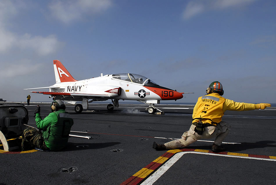 PACIFIC OCEAN (May 13, 2008) Aircraft launching officer Lt. Everett Alcorn signals the launch of a T-45C Goshawk from Training Wing (TW) 1 from the flight deck of the Nimitz-class aircraft carrier USS John C. Stennis (CVN 74). Stennis and embarked TW-1 and 2 are conducting Naval Aviation Training Command carrier qualifications off the coast of Southern California. U.S. Navy photo by Mass Communication Specialist 2nd Class Ron Reeves