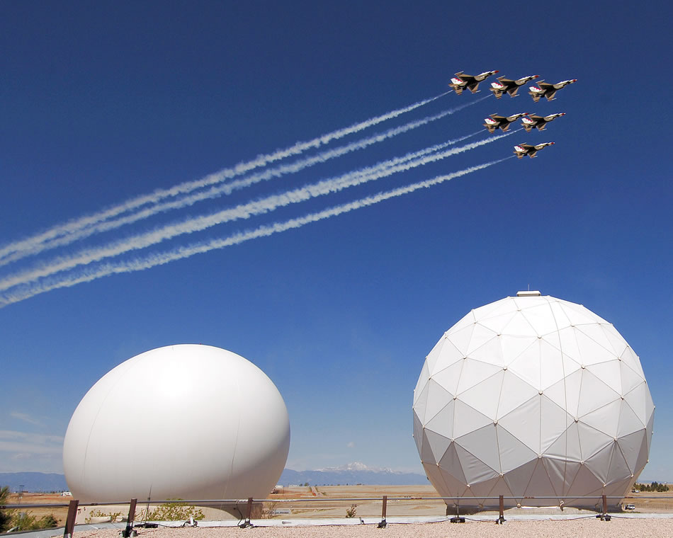 The Air Force Thunderbirds fly over Schriever Air Force Base, Colo., May 25. In the foreground are twin radomes of the Colorado Tracking Station, part of the Air Force Satellite Control Network. (U.S. Air Force photo/Amber Whittington)