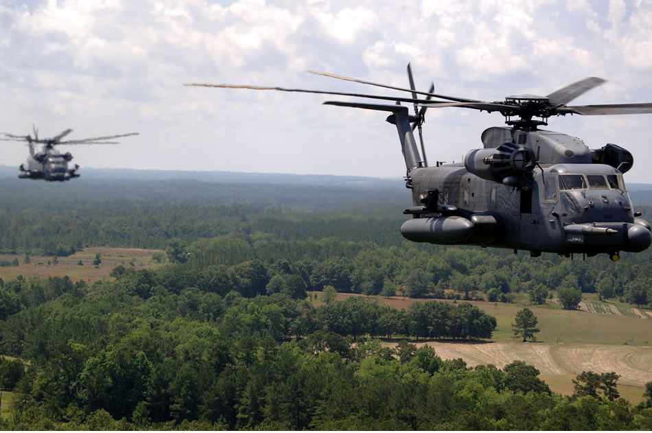 A group of MH-53 Pave Low helicopters from the 20th Special Operations Squadron at Hurlburt Field, Fla., fly over a live-fire range June 12 at Eglin Air Force Base, Fla. The medium-lift helicopter is the largest, most powerful and technologically advanced helicopter in the Air Force inventory. (U.S. Air Force photo/Senior Airman Emily Moore)