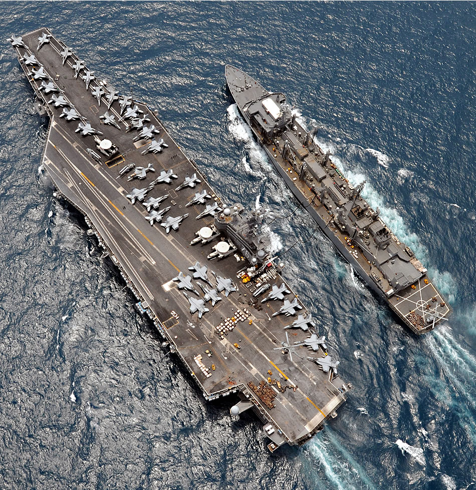 PACIFIC OCEAN (Aug. 15, 2008) The aircraft carrier USS Ronald Reagan (CVN 76) and the Military Sealift Command fast combat support ship USNS Bridge (T-AOE 10) maneuver together during a replenishment at sea. The Ronald Reagan Carrier Strike Group is on a scheduled deployment in the U.S. 7th Fleet area of responsibility, operating in the western Pacific and Indian oceans. U.S. Navy photo by Senior Chief Mass Communication Specialist Spike Call