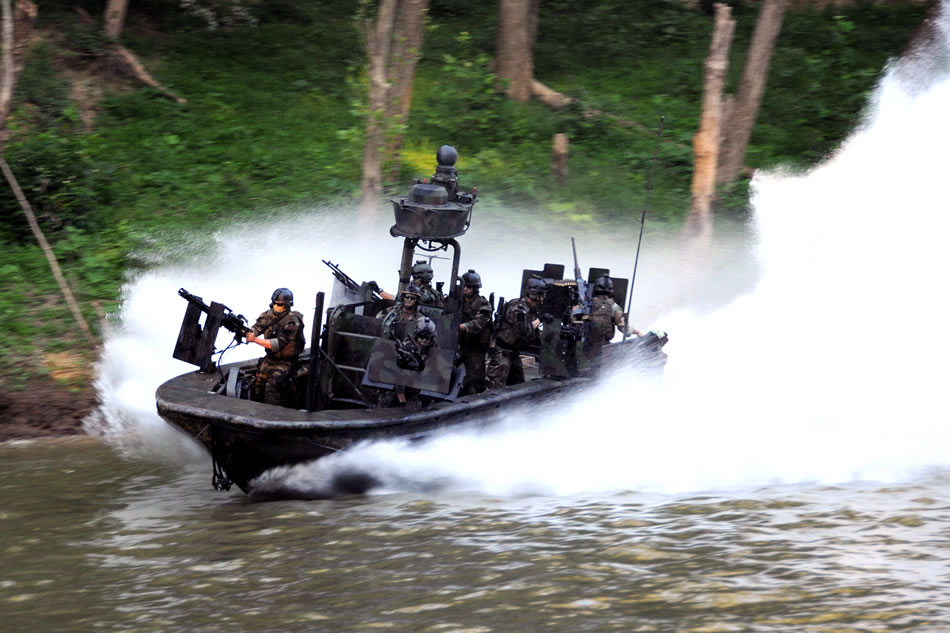 U.S. Navy Special Warfare Combatant-craft crewmen assigned to Special Boat Team 22 conduct live-fire immediate action drills at the riverine training range at Fort Knox, Ky., Aug. 11, 2008. SBT-22 is the only U.S. special operations command dedicated to operating in the riverine environment. U.S. Navy photo by Chief Kathryn Whittenberger