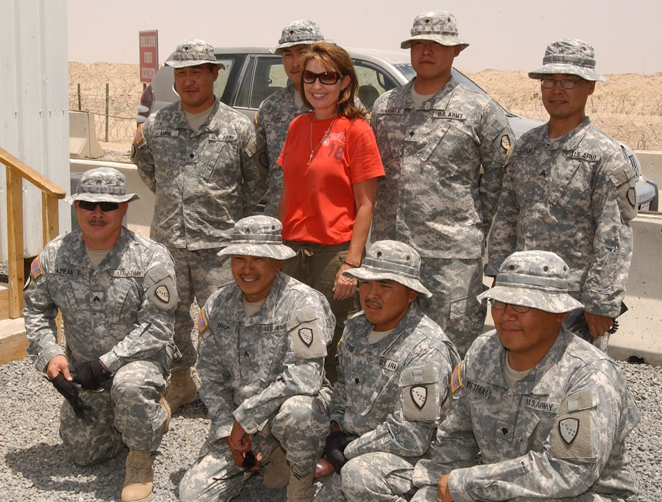 Soldiers from Company B, 3rd Battalion, 297th Infantry Regiment, pose for a photo with their governor, Gov. Sarah Palin, July 25, 2007. The Alaska government official ended her two-day tour of Kuwait's bases at lunch with her Soldiers at the Camp Virginia Dining Facility. Photo by Spc. Wesley Landrum
