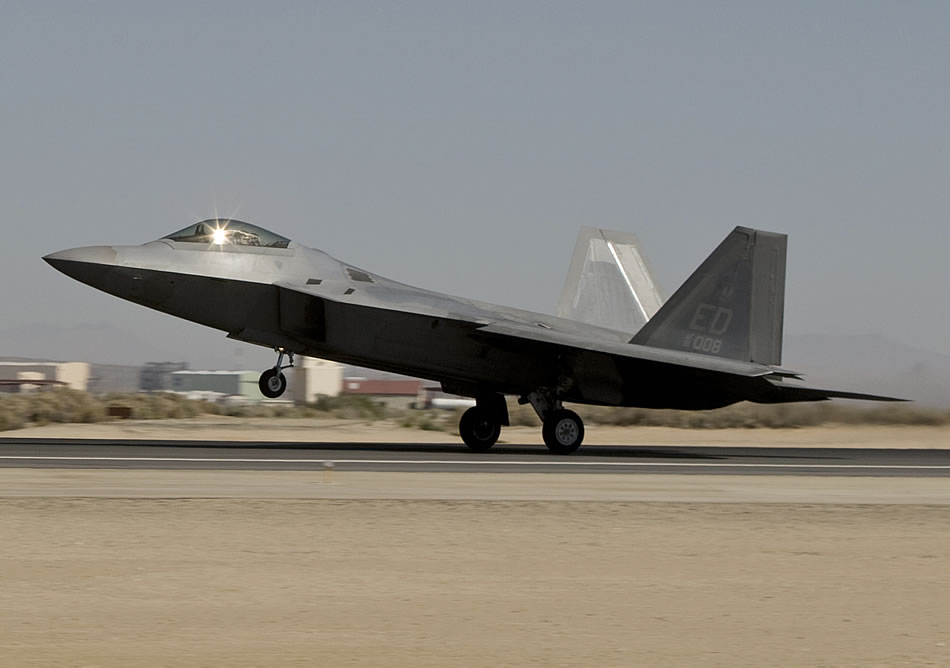 An F-22 Raptor takes off from Edwards Air Force Base, Calif., Aug. 28 to take part in an aerial refueling test using an alternative jet engine fuel -- a first for an Air Force aircraft. The fuel is a 50/50 mix of JP-8 jet fuel and a natural gas-based fuel. (Lockheed Martin photo)