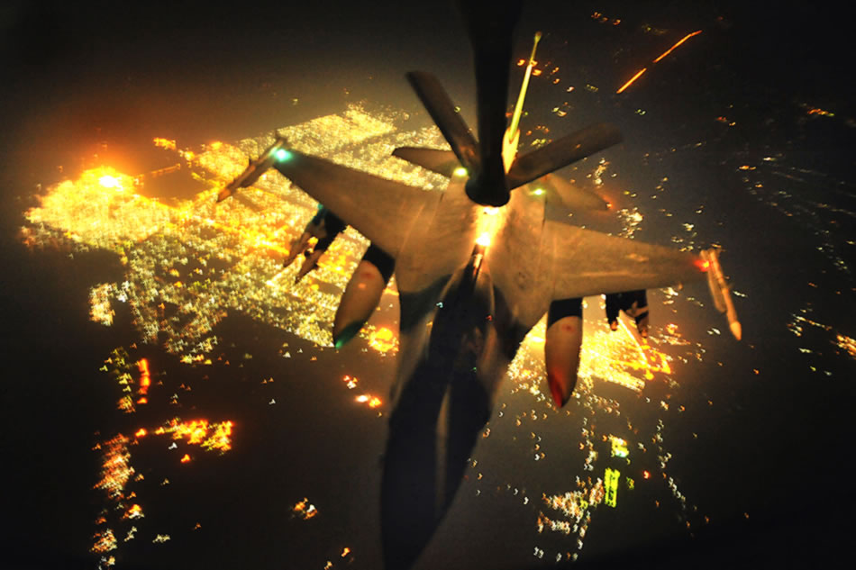 An F-16 Fighting Falcon aircraft from Joint Base Balad, Iraq, refuels from a KC-135 Stratotanker aircraft from the 763rd Expeditionary Refueling Squadron during a mission over Iraq, Sept. 3, 2008. U.S. Air Force photo by Staff Sgt. Aaron Allmon II