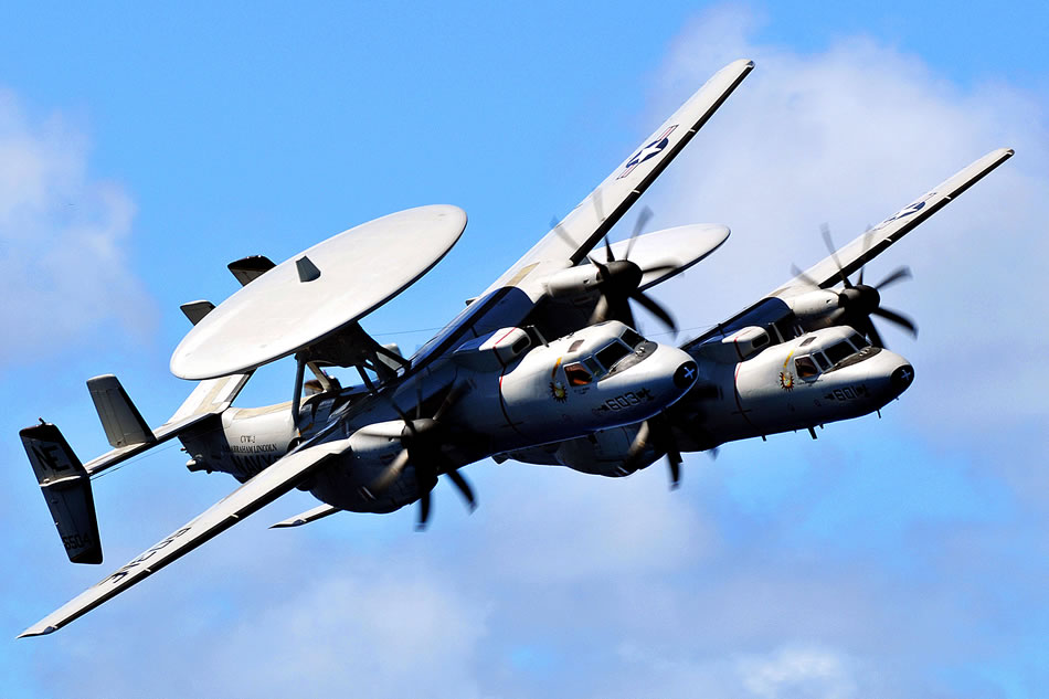 A pair of E-2C Hawkeyes assigned to the "Sun Kings" of Airborne Early Warning Squadron 116 pass over the aircraft carrier USS Abraham Lincoln during an air power demonstration performed by aircraft from Carrier Air Wing 2, Pacific Ocean, Sept. 29, 2008. U.S. Navy photo by Petty Officer 2nd Class James R. Evans