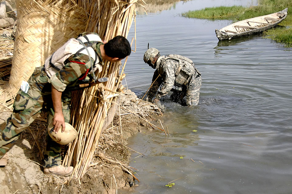 An Iraqi soldier looks on as U.S. Army Pvt. James Murray searches the water for weapons and explosives during a mission in Sayyid Bartu, Dhi Qar province, Iraq, Oct. 11, 2008. Murray is assigned to assigned to 1st Cavalry Division's Headquarter Company, 2nd Battalion, 12th Armored Cavalry Regiment. U.S. Army photo by Spc. Lester Colley