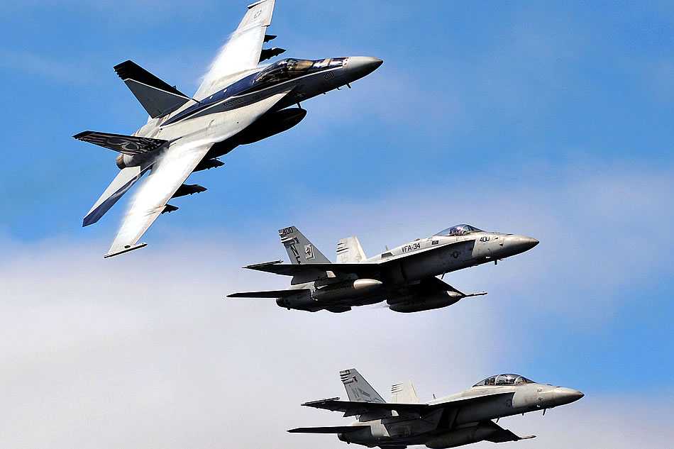 U.S. Navy Capt. John Aquilino, outgoing commander of Carrier Air Wing 2, banks an F/A-18E Super Hornet strike fighter over the aircraft carrier USS Abraham Lincoln, turning the lead of the formation over to incoming commander Capt. Alton Ross, during CVW 2 aerial change of command ceremony over the Pacific Ocean, Oct. 6, 2008. The USS Lincoln and CVW 2 are returning from a seven-month deployment to the U.S. 5th Fleet area of operations. U.S. Navy photo by Petty Officer 2nd Class James R. Evans
